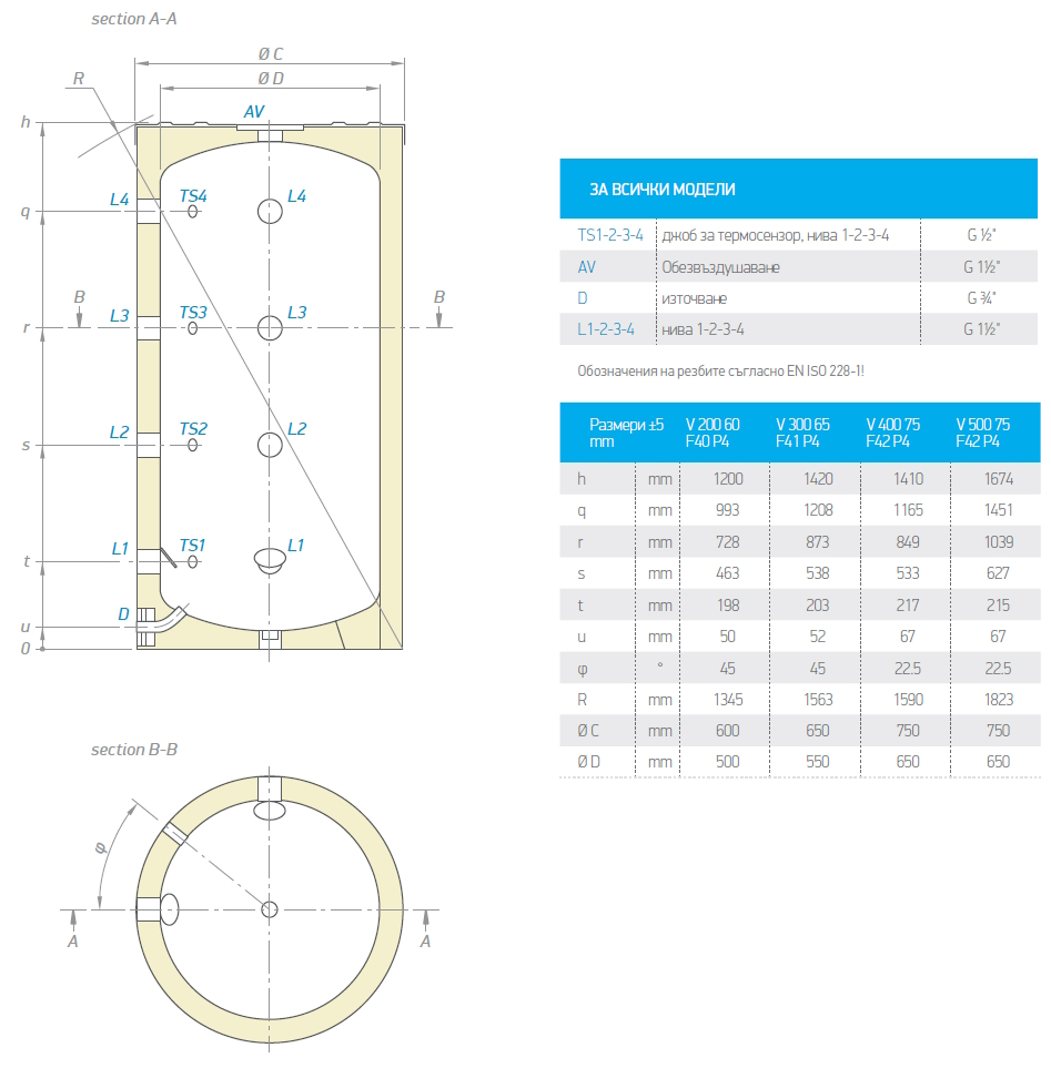 Буферен съд Tesy V 300 65 F41 TP4 е стоящ на пода модел. Моделът е със стоманен водосъдържател без емайлово покритие с вместимост 300 литра. Може да се използва за съхраняване на топла вода за отоплителни инсталации. Притежава високоефективна CFC FREE 50 mm пенополиуретанова изолация.