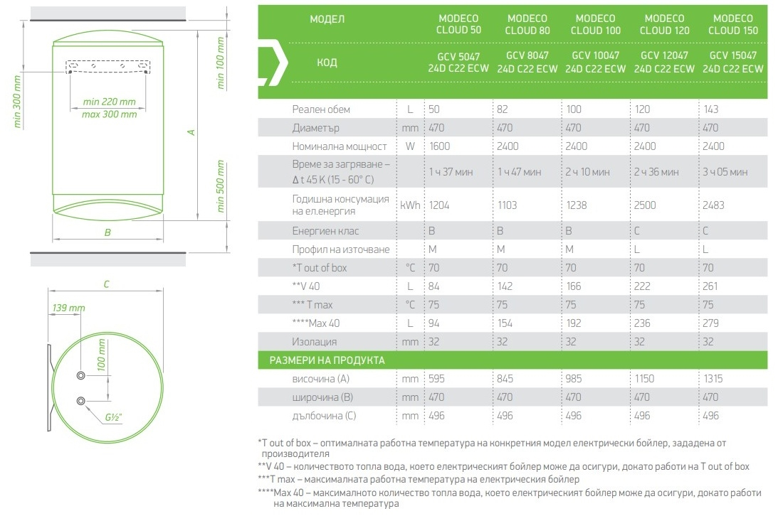 Електрически бойлер TESY ModEco Cloud- с WIFI управление 100л. 2400W, вертикален