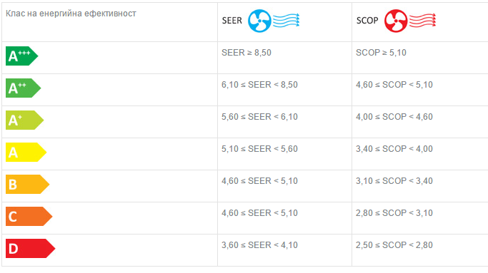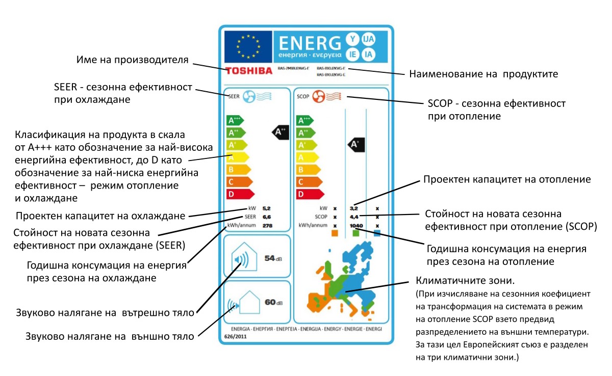 Енергийният етикет представлява визуална информация, която класифицира енергийната ефективност на климатика по скала от A+++ до D. Тази скала е разделена според: