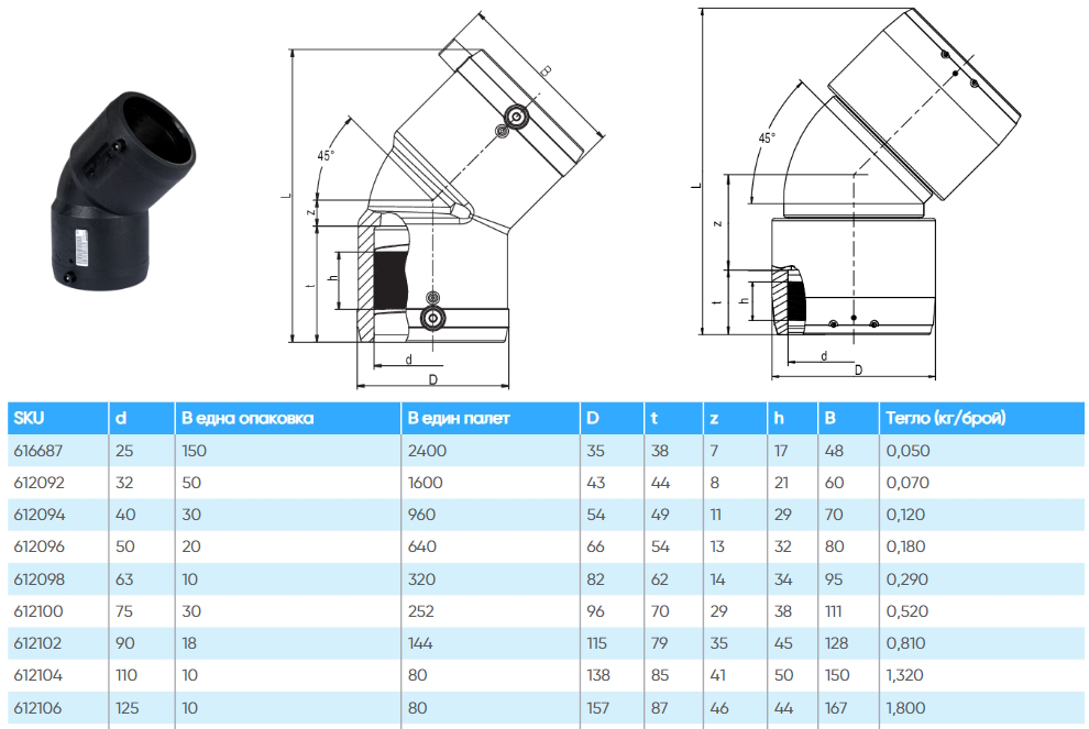 Електрозаваряемо PE Коляно с открит проводник на загряващия елемент за оптимален пренос на топлината, голяма дълбочина на монтаж, широки зони на заваряване, хладни зони в двата края и средата, предпазващи от изтичане на разтопен материал. Работа без допълнителни фиксиращи приспособления.