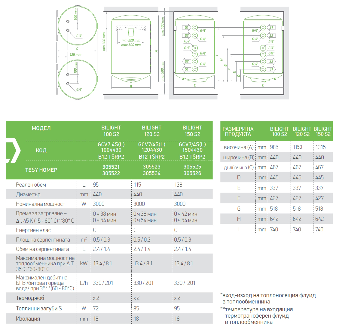Бойлер TESY BiLight 95л. 3000 W, две леви серпентини