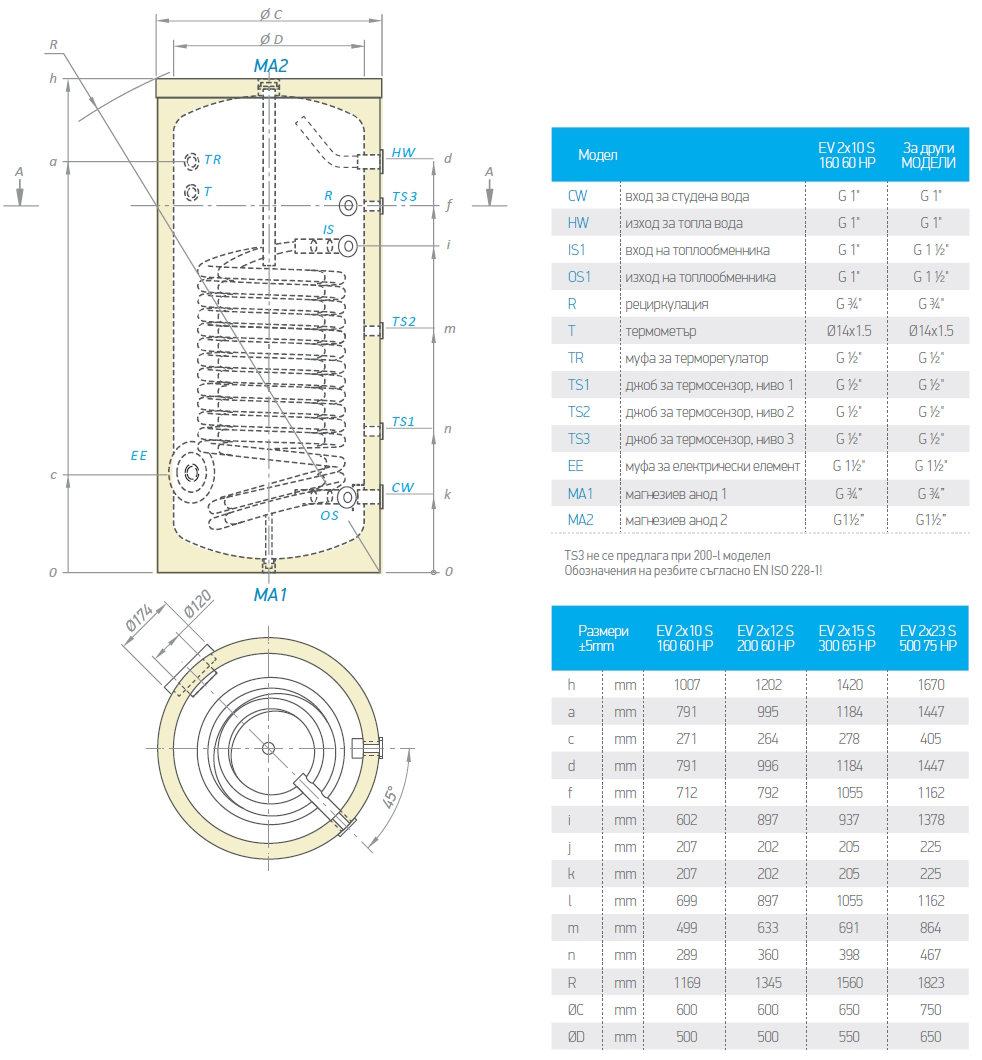 Бойлер TESY ProfiLine EV 2X15S, 300л, с една двойно навита серпентина